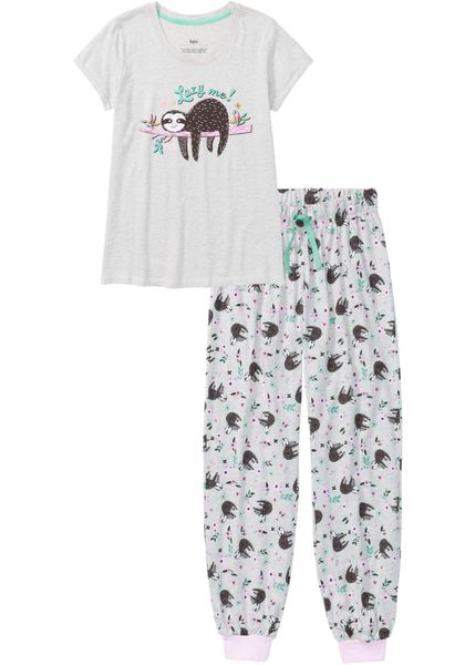 Miękka piżama z nadrukiem z motywem leniwców. Bluzka z krótkim rękawem z wywinięciem i wygodnym okrągłym dekoltem. Spodnie z wiązanym paskiem w talii do regulacji obwodu. W dole nogawki elastyczny ściągacz.