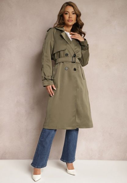 Ciemnozielony Długi Płaszcz Trencz Dwurzędowy z Paskiem w Komplecie Sabila