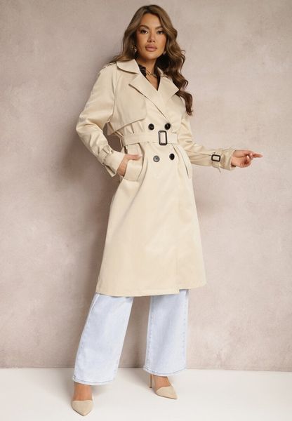 Beżowy Długi Płaszcz Trencz Dwurzędowy z Paskiem w Komplecie Sabila