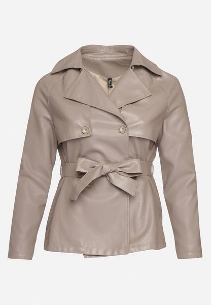 Ciemnobeżowy Dwurzędowy Płaszcz z Ekoskóry Ozdobiony Wiązaniem w Talii Eviseas