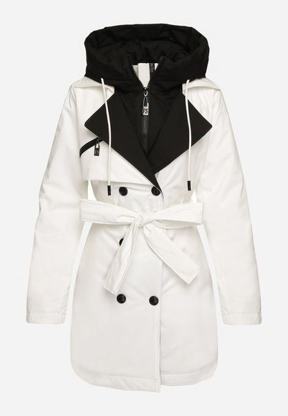 Biała Kurtka Płaszcz z Kapturem Dwurzędowa z Paskiem w Talii Eriviana
