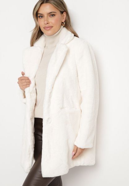Jasnobeżowy Futerkowy Płaszcz Jednorzędowy z Kieszeniami i Eleganckim Kołnierzem Daienna
