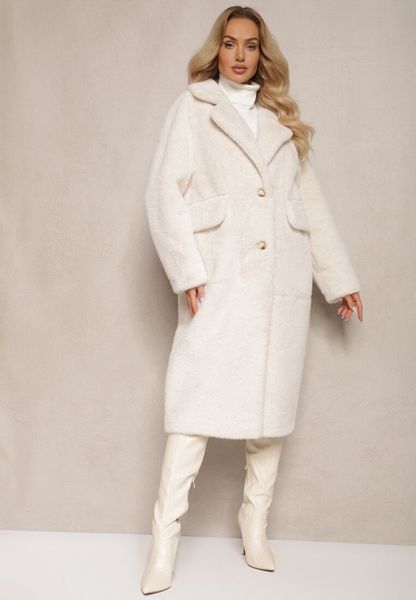 Biały Płaszcz z Futra z Zapięciem na Guziki i Wsuwanymi Kieszeniami Paritha