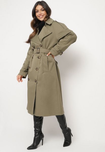 Zielony Dwurzędowy Płaszcz Trencz o Oversizowym Kroju z Paskiem Inathara