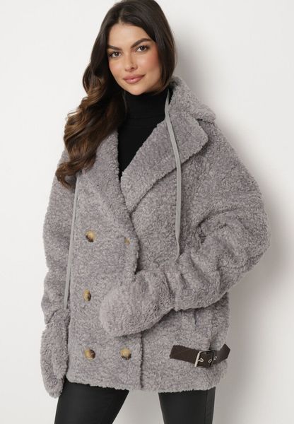 Szara Futrzana Kurtka Płaszcz Dwurzędowy z Dołączonymi Rękawiczkami Hetista