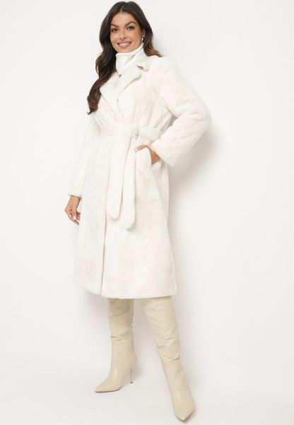 Jasnobeżowy Płaszcz Futrzany Dwurzędowy w Stylu Szlafroka Izarethia