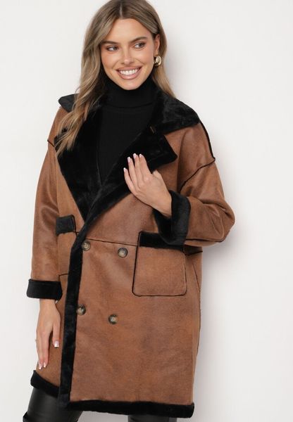 Brązowy Dwurzędowy Płaszcz z Futerkowymi Wstawkami i Wsuwanymi Kieszeniami Torcella