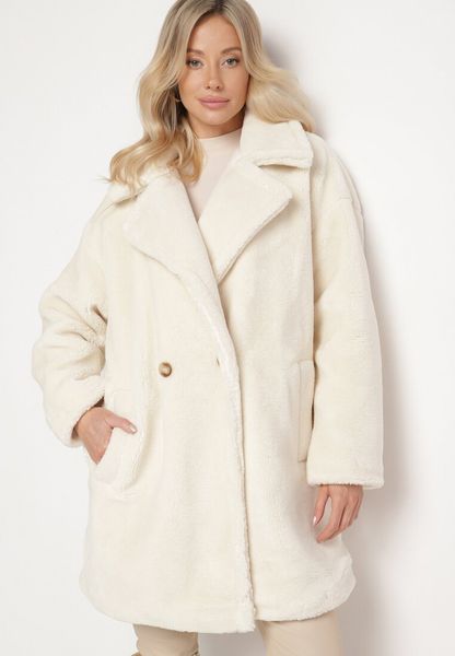 Jasnobeżowy Długi Płaszcz Futerko Dwurzędowe w Stylu Teddy Malwirae