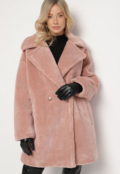 Różowy Długi Płaszcz Futerko Dwurzędowe w Stylu Teddy Malwirae
