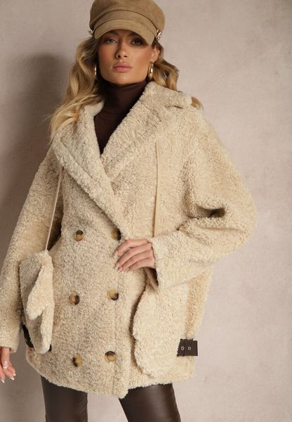Jasnobeżowa Dwurzędowa Kurtka Futerkowy Płaszcz z Dodatkowymi Rękawiczkami Hetirra