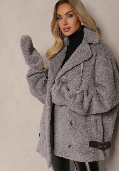 Szara Dwurzędowa Kurtka Futerkowy Płaszcz z Dodatkowymi Rękawiczkami Hetirra