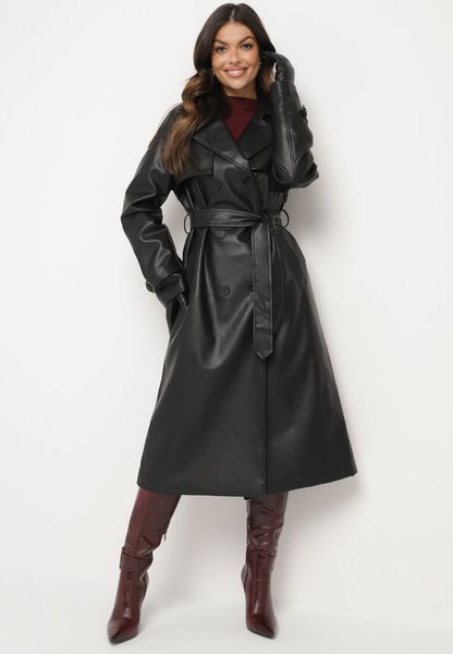 Czarny Płaszcz w Stylu Trencza z Ekoskóry Paskiem w Talii i Ozdobnymi Klapami Sintesca