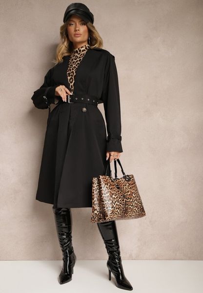Czarny Dwurzędowy Płaszcz Typu Trencz z Pagonami i Paskiem w Talii Malwizia