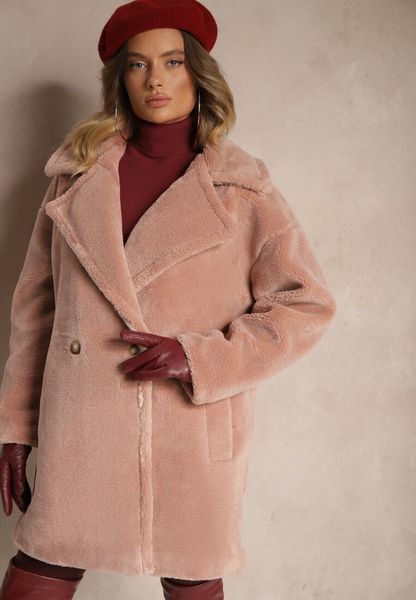 Różowy Dwurzędowy Płaszcz Futrzany o Długim Kroju Typu Teddy Malwika