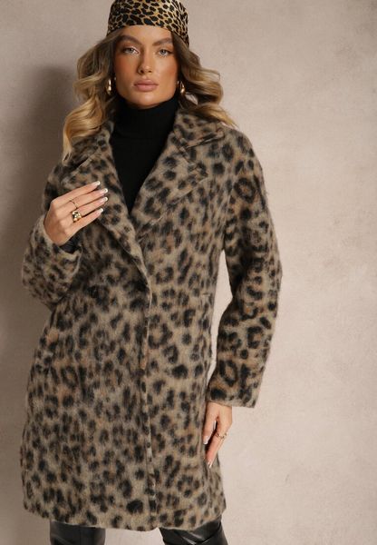 Beżowy Panterkowy Płaszcz Dwurzędowy z Wsuwanymi Kieszeniami Niarelith