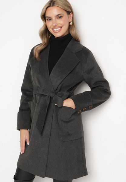 Ciemnoszary Dwurzędowy Płaszcz z Wiskozą z Kieszeniami i Wiązanym Paskiem Alninnia