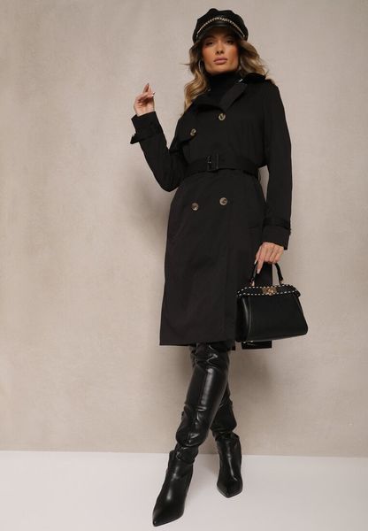 Czarny Dwurzędowy Płaszcz Trencz z Paskiem i Elegancką Klapą Fireti