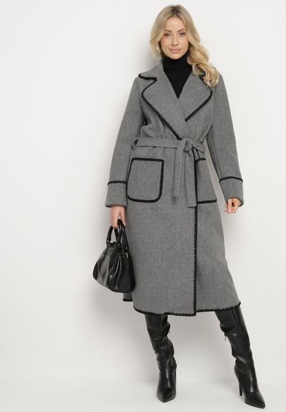 Szary Płaszcz z Kontrastowymi Obszyciami o Szlafrokowym Kroju z Wiązanym Paskiem Norenamia