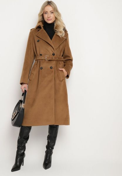 Brązowy Długi Dwurzędowy Płaszcz z Paskiem Senoriel