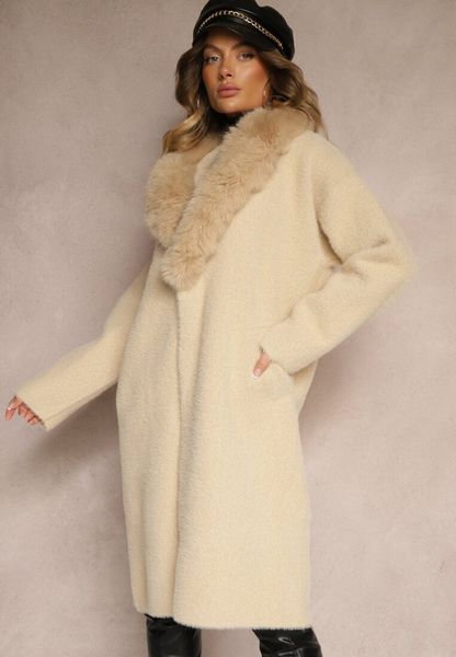 Beżowy Płaszcz z Dzianiny z Wełną Zdobiony Odpinanym Futrem Veliti