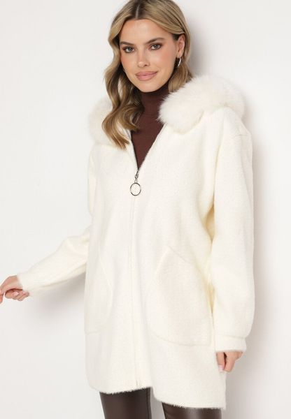 Jasnobeżowy Płaszcz Rozpinany z Wełną i Wiskozą Ozdobiony Kołnierzem z Futerkiem Wesalttia
