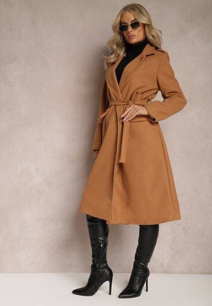 Ciemnobeżowy Taliowany Płaszcz z Wiązanym Paskiem Seraphique