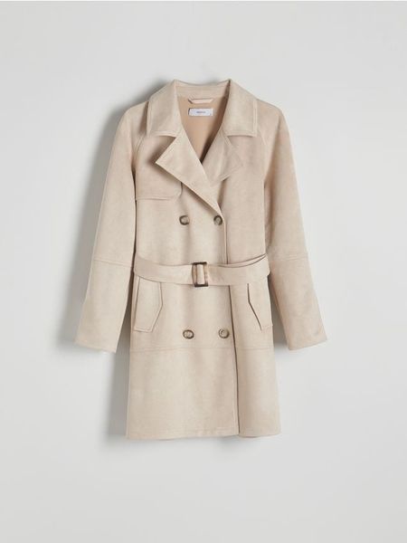 Trencz o prostym kroju, wykonany z imitacji zamszu.