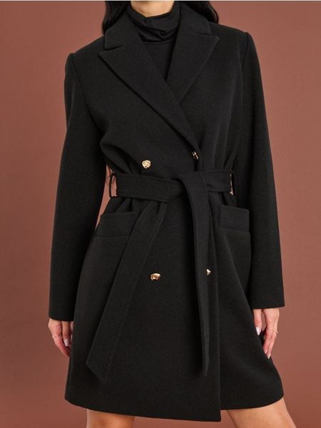 Sinsay – Płaszcz z paskiem – czarny – klasyczny krój,ozdobne guziki,wiązany pasek w talii,dwie kieszenie z przodu