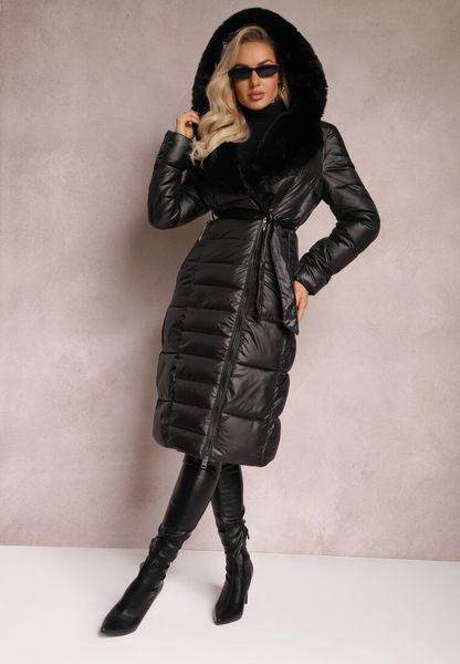 Czarna Pikowana Kurtka Płaszcz za Kolano z Wiązanym Paskiem i Futerkiem Vivenda