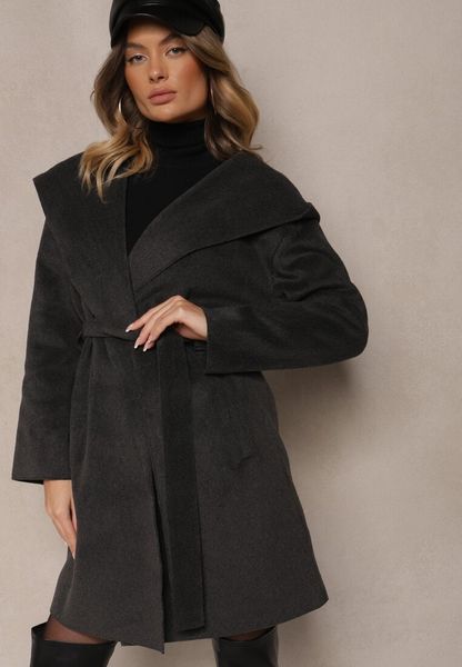 Ciemnoszary Płaszcz z Wiskozą Kapturem i Paskiem w Talii Ninerviria