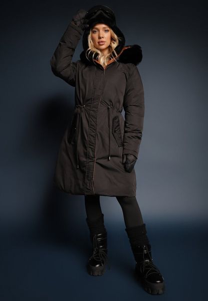 Dwustronna kurtka płaszcz – jedna strona z pikowaniem, druga gładka. Kurtka jest lekko taliowana za pomocą troczków, posiada kaptur ozdobiony futerkiem oraz kieszenie na wysokości bioder.