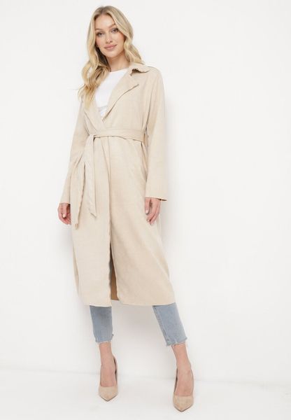 Jasnobeżowy Długi Płaszcz Wiązany w Pasie z Wsuwanymi Kieszeniami Galattea