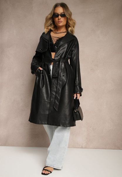 Czarny Ekoskórzany Płaszcz Dwurzędowy w Stylu Trencza z Paskiem Zerilina