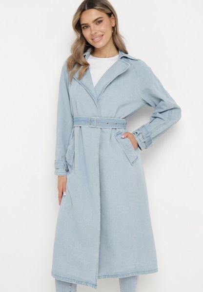Niebieski Jeansowy Płaszcz za Kolano z Paskiem ze Sprzączką Sumiorre