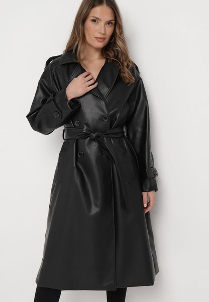 Czarny Dwurzędowy Płaszcz Wiązany w Pasie z Kieszeniami Asella