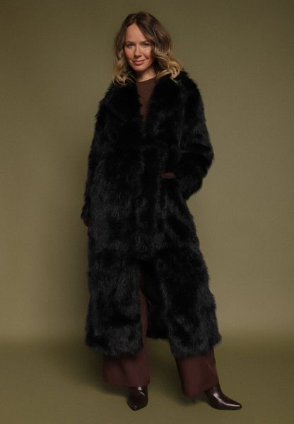 Czarny Płaszcz Futerko z Wiązanym Paskiem Denella