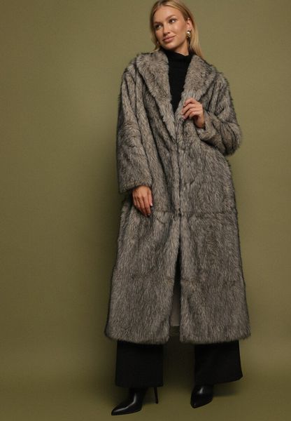 Beżowo-Czarny Długi Płaszcz Futrzany z Kołnierzem Banisse