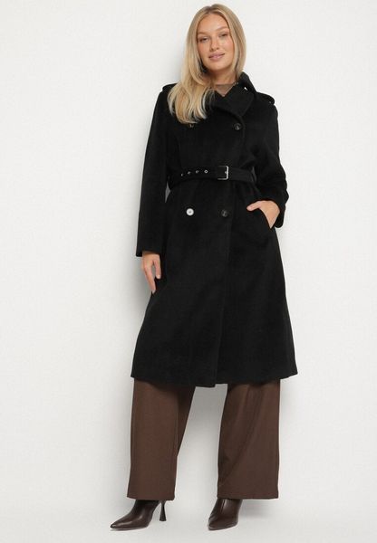 Czarny Długi Dwurzędowy Płaszcz z Paskiem Senoriel