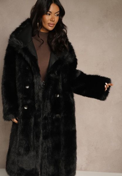 Czarny Dwurzędowy Płaszcz Futerko o Dwustronnym Kroju z Kołnierzem Nalaneva