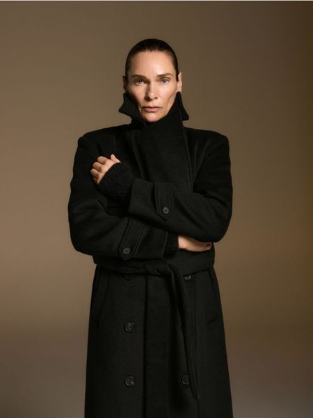 Płaszcz o klasycznym fasonie, wykonany z tkaniny z wełną.