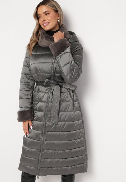 Szara Kurtka Pikowana Płaszcz za Kolano z Odpinanym Kapturem i Sztucznym Futerkiem Ascendia