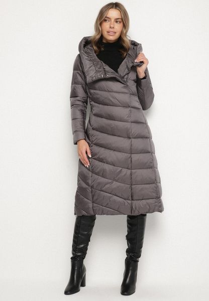 Szara Długa Pikowana Kurtka Płaszcz z Kapturem i Ozdobnymi Suwakami Vlemika