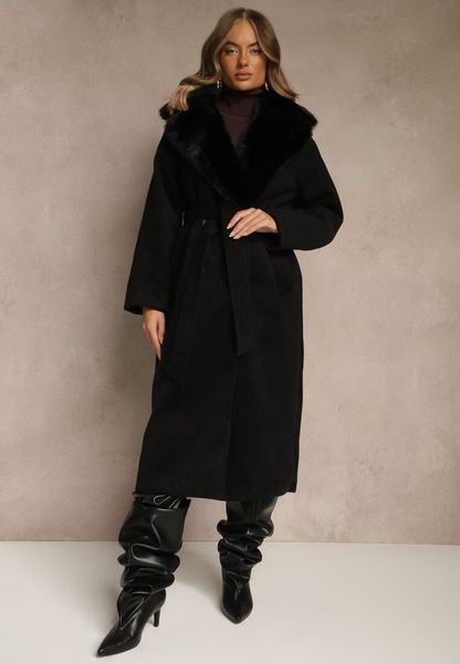 Czarny Dwurzędowy Płaszcz Elegancki z Futrzanym Kołnierzem i Paskiem Ezanttia