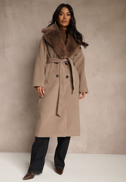 Beżowy Dwurzędowy Płaszcz Elegancki z Futrzanym Kołnierzem i Paskiem Ezanttia