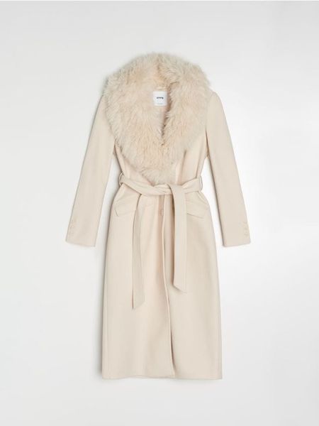 Sinsay – Długi płaszcz z futrzanym kołnierzem – kremowy –