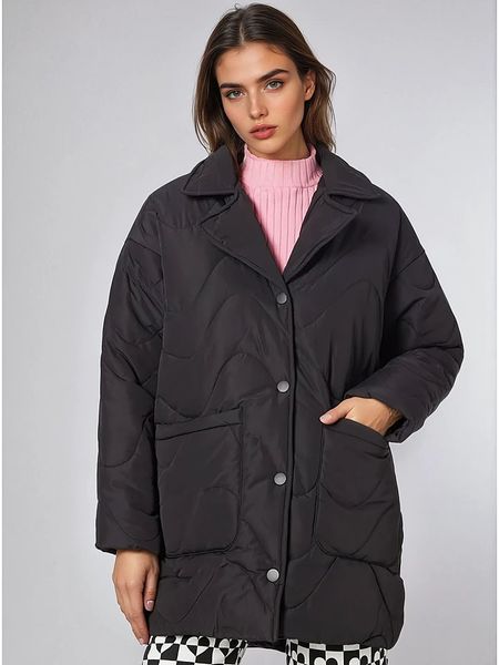 – kołnierzyk: z klapami- zapięcie: zatrzaski- kieszenie: naszyte- krój: oversized- pikowanie: tak- look: jednokolorowy