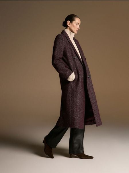 Płaszcz o prostym kroju, wykonany z tkaniny z wełną.