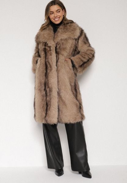 Brązowy Płaszcz Futro z Szerokim Kołnierzem i Kieszeniami Ezinda