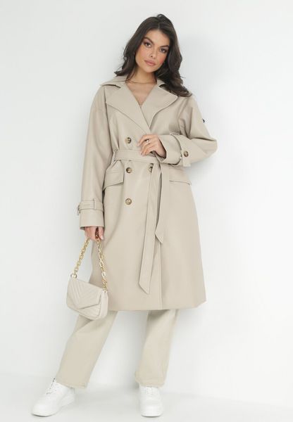 Płaszcz Isatia z imitacji skóry. Model dwurzędowy z paskiem z tego samego materiału. Na wysokości bioder kieszenie z klapami. Przy rękawach paski z guzikami. Świetnie sprawdzi się w sezonie wiosennym i jesiennym.