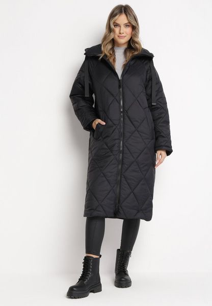Czarna Długa Kurtka Pikowana Płaszcz z Nieodpinanym Kapturem Rordanos